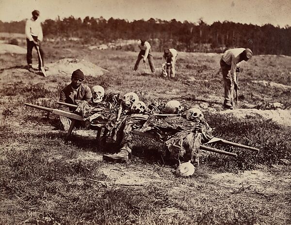 This work of art is currently on loan to the museum.Few of the photographs in the Sketch Book evoke the intense sadness of A Burial Party, Cold Harbor, Virginia, one of the seven photographs Gardner included by the still-obscure field operative John Reekie. It is the only plate in the second volume that shows corpses, here being collected by African American soldiers. Four soldiers with shovels work in the background; in the foreground, a single laborer in a knit cap sits crouched behind a bier that holds the lower right leg of a dead combatant and five skulls—one for each member of the living work crew. Reekie’s atypical low vantage point and tight composition ensure that the foreground soldier’s head is precisely the same size as the bleached white skulls and that the head of one of the workers rests in the sky above the distant tree line. It is a macabre and chilling portrait—literally a study of black and white—that is as memorable as any made during the war.