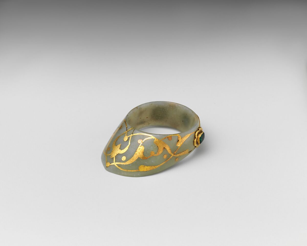 A thumb ring provided the archer with a firmer grip of the bowstring. As archery was considered a noble sporting exercise, thumb rings, often carried ostentatiously on strings hung from the belt, were worn as symbols of elevated social status. This example, fashioned in pale green nephrite jade set with gemstones in gold foliate mounts, is typically Ottoman. Similar rings are associated with Sultan Süleyman the Magnificent (r. 1520–66) and his immediate successors.