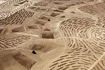 In 2011 the French photographer Frederic Brenner invited eleven prominent photographers to spend six months in residence in Israel and the Occupied Territories, or West Bank, to explore the area’s complexity and to create bodies of work that might broaden and reframe the conversation about the region. Among those invited was Sheikh, an artist best known for his sensitive black-and-white portraits of people living in displaced and marginalized communities around the world. Sheikh’s project takes the form of a trilogy titled Erasure, of which Desert Bloom is the central part. The images were made during several months of flying above the Negev desert and are intended to articulate the rapid transformation of the region. On the one hand, they invoke the Israeli endeavor to “make the desert bloom,” and on the other, they reveal traces of the Negev’s history: the construction of towns for the Bedouin, the natural erosion of the land, the demolition of local dwellings, the remains of military installations, the afforestation campaigns of the Jewish National Fund (JNF), and the transformation of nomadic desert regions into farmland.