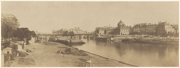the Louvre at left to the piles of quarried stone near the Institut de France at right. Although panoramic cameras were in use at the time, Marville made this print by joining two negatives, made side by side, and printing them together as a single seamless image.