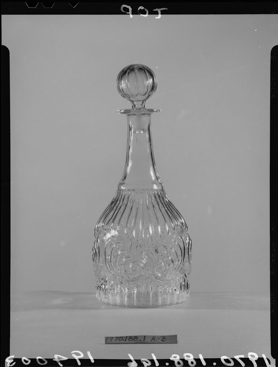 This pattern of this decanter typifies the Baroque-revival style and signals a departure from earlier imitation of cut patterns in mold-blown glass. The decanter is in the same pattern as a tumbler, 39.56.4.