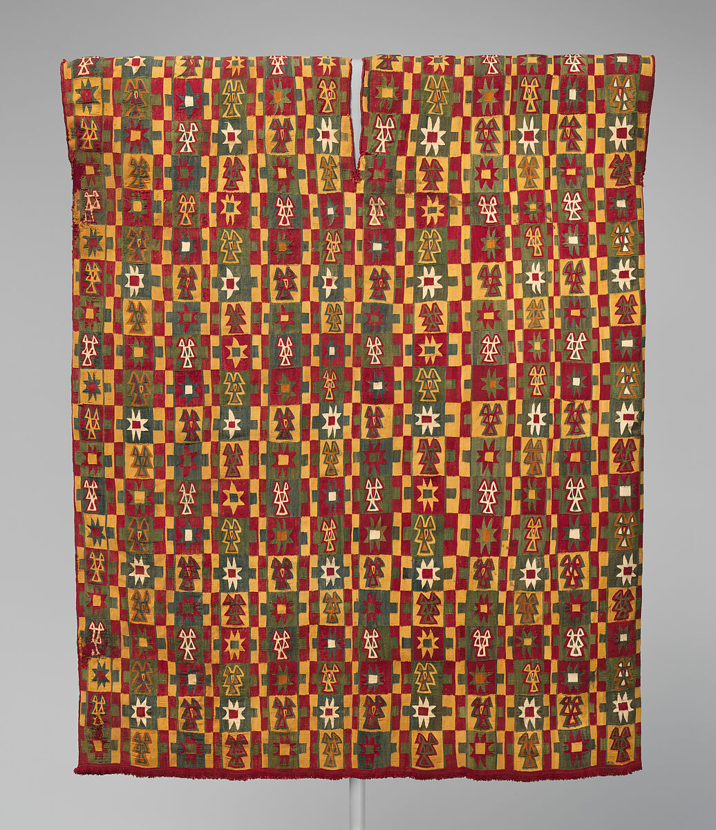 This tunic was woven by artists of the Chuquibamba culture, who lived on the southern coast and inland valleys of Peru. Textiles of this type were previously thought to have been created by Inca weavers; recent scholarship, however, has revealed that Chuquibamba was a distinct culture that preceded the rise the Inca Empire. After this region was incorporated into the Inca empire, Chuquibamba weavers retained many of their own stylist traditions that can be distinguished from classic Inca styles. For example, in a typical Inca tunic, eight-pointed stars are a solid color rather than having an interior square of a different color, as in this example. Yet elements of Inca imperial design were adopted by Chuquibamba weavers, such as the general proportion of tunics.