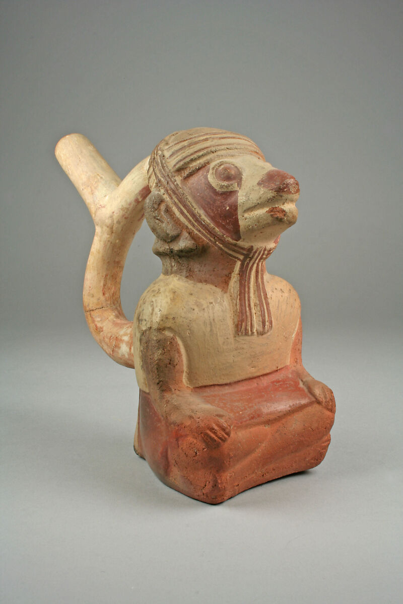 This ceramic stirrup-spout bottle was sculpted in the shape of a seated, cross-legged spectacled bear (Tremarctos ornatus) with human arms and hands resting on the knees. The bear wears a cream-colored tunic and a headdress tied under the chin, painted using red-ochre and cream slips (a suspension of clay and/or other colorants in water). The creature’s face features a broad, vertical white stripe in the center, flanked by two red stripes, emulating both the natural coloration of the bear’s face and the type of face paint seen on ceramic portraits of human warriors (see accession number 64.228.21).