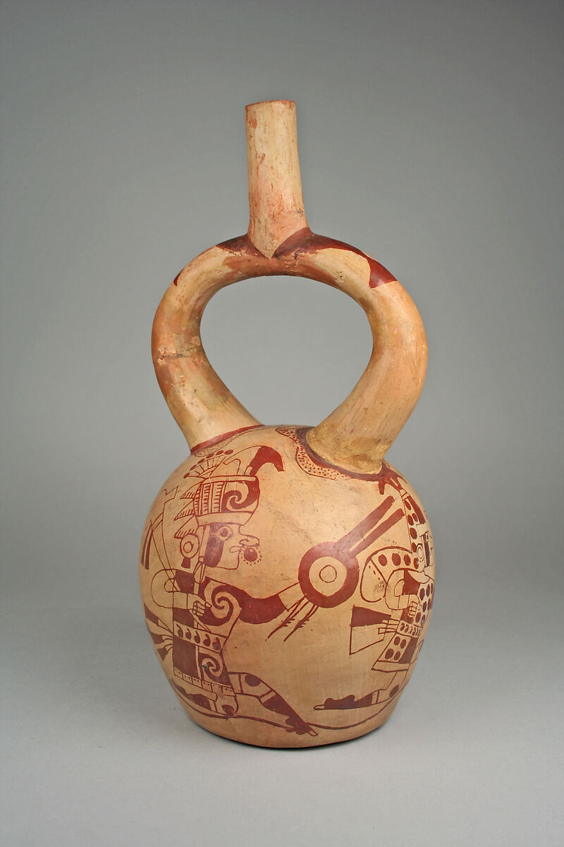 The artist further embellished the vessel by painting triangular forms on the lower arms of the spout and wavy lines at the attachment points. The stirrup-spout vessel—the shape of the spout recalls the stirrup on a horse's saddle—was a much favored form on Peru's northern coast for about 2,500 years. Although the importance and symbolism of this distinctive shape is still puzzling to scholars, it has been suggested that the double-branch/single-spout configuration may have prevented evaporation of liquids, and/or that it was convenient for carrying. Early in the first millennium A.D., the Moche elaborated stirrup-spout bottles into sculptural shapes depicting a wide range of subjects, including human figures, animals, and plants worked with a great deal of naturalism. About 500 years later, bottle chambers became predominantly globular, as in the present example, providing large surfaces for painting complex, multi-figure scenes.