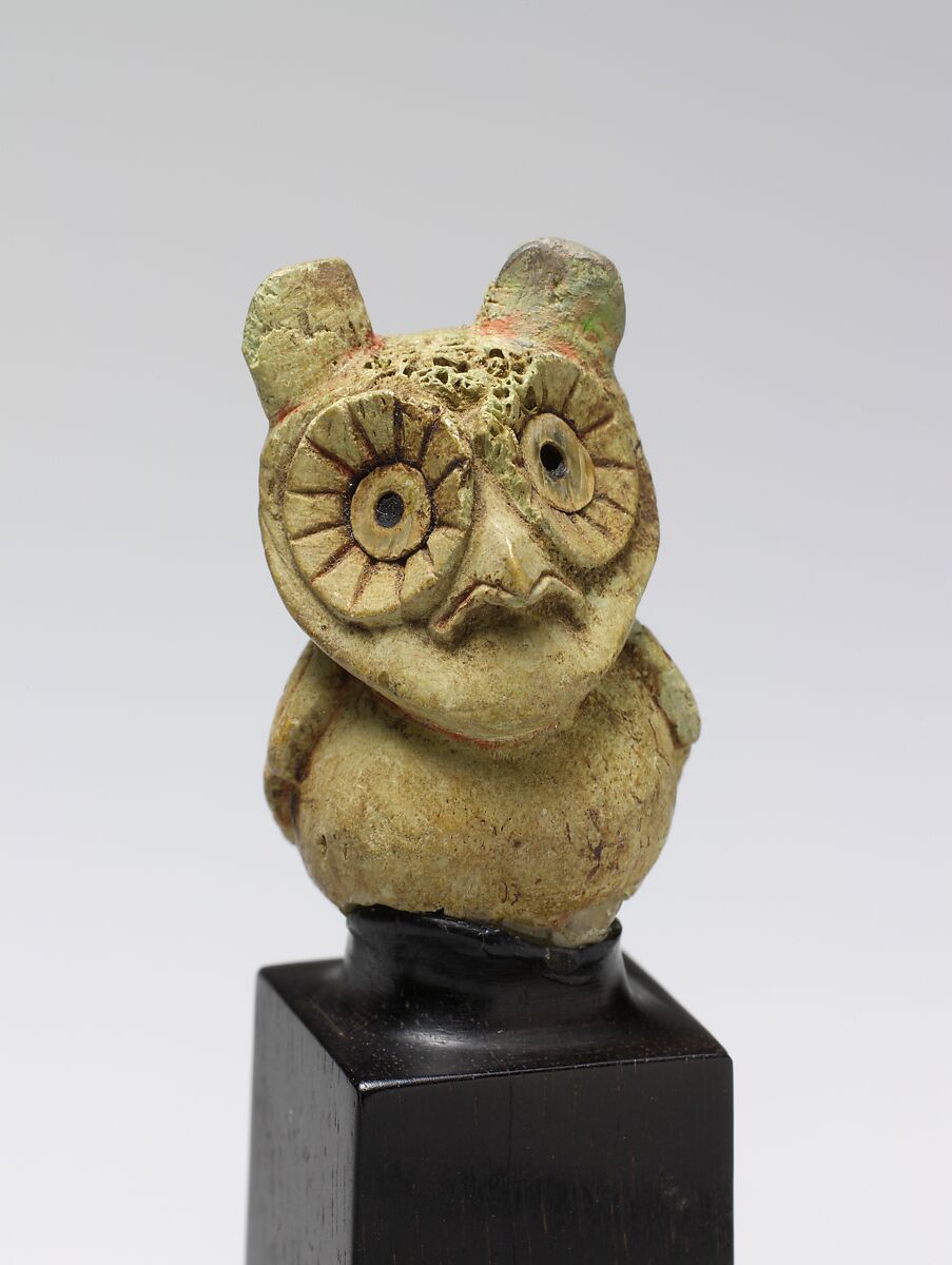 This skillfully carved owl was probably originally designed to serve as a thumb rest on a throwing stick or atlatl. Spear throwers or atlatls, used in Europe, Asia, and the Americas, are simple but deadly weapons. When the dart or spear is engaged by a point or nub at the distal end of the stick, throwing the spear increases the velocity and distance via enhanced leverage. Throwing sticks are known in Europe from as early as 15,000 B.C. Many variations exist from simple sticks with articulating notches to more elaborate versions with a carved thumb hold, decorated shaft and modeled spear holder. The position of the thumb hold varies and can be on the same or opposite side of the articulation element. Peruvian craftsmen elaborated all of these elements of the atlatl to enhance their beauty. In addition to decorating the thumb hold or shaping the engagement knob, throwing sticks were also occasionally embellished with gold sheet. (For an example of depictions of warriors with spear throwers see Met accession number 1987.394.86.)