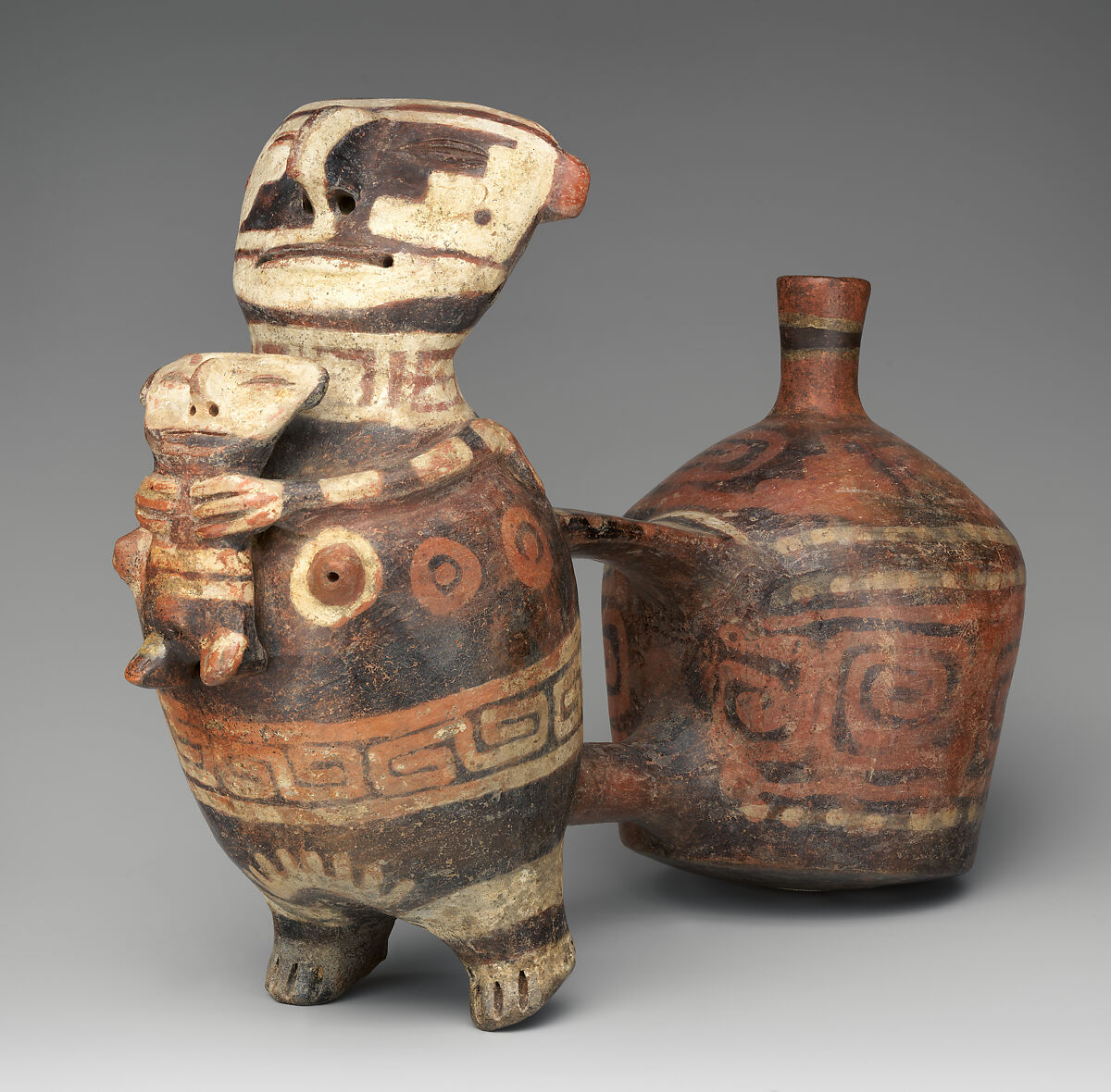 The Vicús culture was contemporary with the larger Moche civilization (farther south on Peru’s coast) and was eventually incorporated into their orbit. The double-chambered shape of the Vicús bottles likely originated farther north, in what is now Ecuador.
