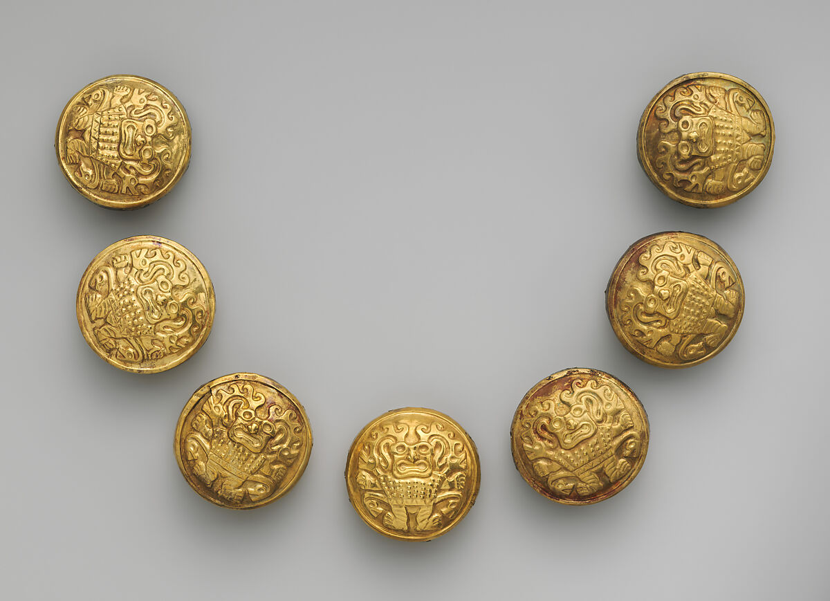 Necklaces of composed of large gold or silver beads are closely associated with high-status individuals in ancient Peru. Such necklaces are among the most striking works to have been found in elite burials of the Moche culture on Peru’s North Coast (Bourget, 2014; Alva and Donnan, 1993; Donnan, 2022). These three (of seven) beads, said to have been found with a second set of beads (see MMA 1974.271.32), once formed part an impressive necklace created for a high-ranking dignitary.