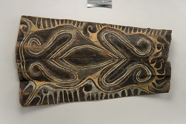 This panel is one of over 270 original paintings commissioned from Kwoma artists in the village of Mariwai in 1970 and 1973 by Douglas Newton, the first curator of Oceanic art in the Department of the Arts of Africa, Oceania and the Americas. Once completed, they were shipped to New York and installed in the galleries. In 2007, when the Oceania galleries at the Metropolitan Museum were renovated, the panels were attached to a new superstructure. Although less steeply pitched than the Kwoma houses found in villages today, the installation evokes the essential form of a ceremonial house ceiling. Together these suspended panels form an impressive and spectacular installation in the Metropolitan Museum which, at 80.4 feet (24.5 meters) end-to-end, is the largest contemporary art installation in the museum.