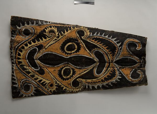This panel is one of over 270 original paintings commissioned from Kwoma artists in the village of Mariwai in 1970 and 1973 by Douglas Newton, the first curator of Oceanic art in the Department of the Arts of Africa, Oceania and the Americas. Once completed, they were shipped to New York and installed in the galleries. In 2007, when the Oceania galleries at the Metropolitan Museum were renovated, the panels were attached to a new superstructure. Although less steeply pitched than the Kwoma houses found in villages today, the installation evokes the essential form of a ceremonial house ceiling. Together these suspended panels form an impressive and spectacular installation in the Metropolitan Museum which, at 80.4 feet (24.5 meters) end-to-end, is the largest contemporary art installation in the museum.