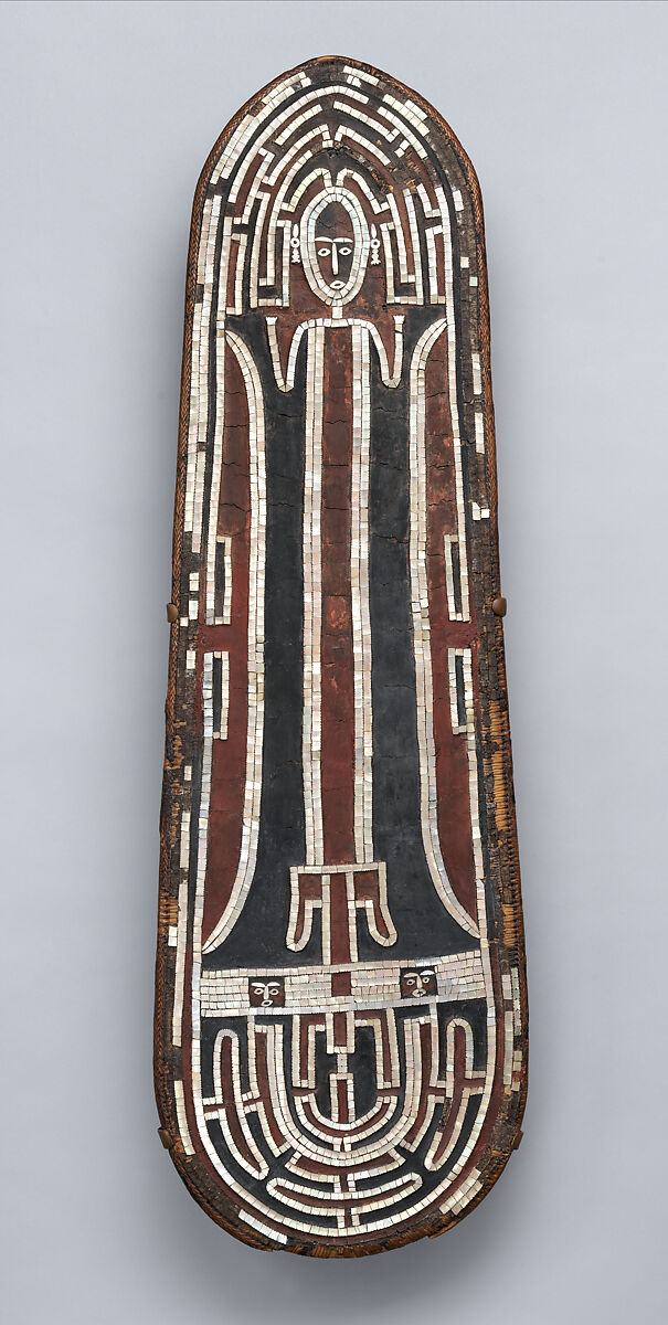 The shield has a woven base of wickerwork rattan, the shape and structure of which is common to many shields made throughout central and western Solomon Islands. The base woven shield has been overmodeled with a sticky, black paste extracted from parinarium nut before the design was inlaid from pieces of nautilus shell that create a luminous, shimmering effect.