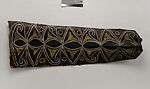 This panel is one of over 270 original paintings commissioned from Kwoma artists in the village of Mariwai in 1970 and 1973 by Douglas Newton, the first curator of Oceanic art in the Department of the Arts of Africa, Oceania and the Americas. Once completed, they were shipped to New York and installed in the galleries. In 2007, when the Oceania galleries at the Metropolitan Museum were renovated, the panels were attached to a new superstructure. Although less steeply pitched than the Kwoma houses found in villages today, the installation evokes the essential form of a ceremonial house ceiling. Together these suspended panels form an impressive and spectacular installation in the Metropolitan Museum which, at 80.4 feet (24.5 meters) end-to-end, is the largest contemporary art installation in the museum.