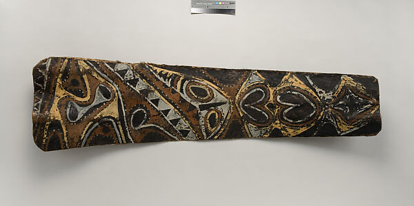 This panel is one of over 270 original paintings commissioned from Kwoma artists in the village of Mariwai in 1970 and 1973 by Douglas Newton, the first curator of Oceanic art in the Department of the Arts of Africa, Oceania and the Americas. Once completed, they were shipped to New York and installed in the galleries. In 2007, when the Oceania galleries at the Metropolitan Museum were renovated, the panels were attached to a new superstructure. Although less steeply pitched than the Kwoma houses found in villages today, the installation evokes the essential form of a ceremonial house ceiling. Together these suspended panels form an impressive and spectacular installation in the Metropolitan Museum which, at 80.4 feet (24.5 meters) end-to-end, is the largest contemporary art installation in the museum.