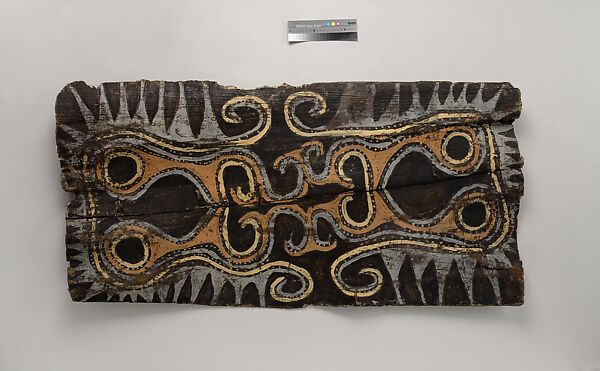 This panel is one of over 270 original paintings commissioned from Kwoma artists in the village of Mariwai in 1970 and 1973 by Douglas Newton, the first curator of Oceanic art in the Department of the Arts of Africa, Oceania and the Americas. Once completed, they were shipped to New York and installed in the galleries. In 2007, when the Oceania galleries at the Metropolitan Museum were renovated, the panels were attached to a new superstructure. Although less steeply pitched than the Kwoma houses found in villages today, the installation evokes the essential form of a ceremonial house ceiling. Together these suspended panels form an impressive and spectacular installation in the Metropolitan Museum which, at 80.4 feet (24.5 meters) end-to-end, is the largest contemporary art installation in the museum.