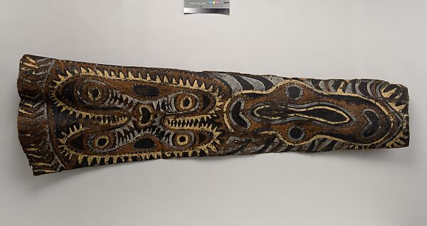 This panel is one of over 270 original paintings commissioned from Kwoma artists in the village of Mariwai in 1970 and 1973 by Douglas Newton, the first curator of Oceanic art in the Department of the Arts of Africa, Oceania and the Americas. Once completed, they were shipped to New York and installed in the galleries. In 2007, when the Oceania galleries at the Metropolitan Museum were renovated, the panels were attached to a new superstructure. Although less steeply pitched than the Kwoma houses found in villages today, the installation evokes the essential form of a ceremonial house ceiling. Together these suspended panels form an impressive and spectacular installation in the Metropolitan Museum which, at 80.4 feet (24.5 meters) end-to-end, is the largest contemporary art installation in the museum.