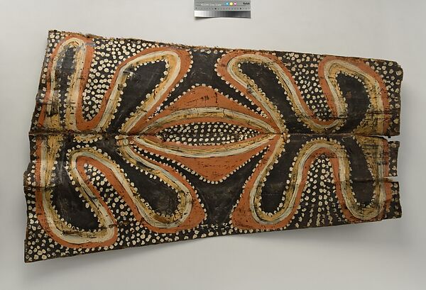 This panel is one of over 270 original paintings commissioned from Kwoma artists in the village of Mariwai in 1970 and 1973 by Douglas Newton, the first curator of Oceanic art in the Department of the Arts of Africa, Oceania and the Americas. Once completed, they were shipped to New York and installed in the galleries. In 2007, when the Oceania galleries at the Metropolitan Museum were renovated, the panels were attached to a new superstructure. Although less steeply pitched than the Kwoma houses found in villages today, the installation evokes the essential form of a ceremonial house ceiling. Together these suspended panels form an impressive and spectacular installation in the Metropolitan Museum which, at 80.4 feet (24.5 meters) end-to-end, is the largest contemporary art installation in the museum.