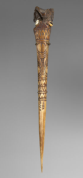 Warriors in the Sepik region formerly employed a variety of weapons. Most, such as spears, were intended to strike the enemy from a distance, but men also carried daggers for use in close combat. With blunt edges and sharp tips, daggers were exclusively stabbing weapons, often used to kill an enemy incapacitated by spears or arrows or, at times, in more stealthy acts of assassination. Many daggers were supernaturally powerful objects that played important roles in male initiation and other ceremonies. Daggers and daggerlike objects were worn as personal ornaments, and many ornate examples with blunt tips may have been ceremonial objects. Daggers were fashioned primarily from the leg bones of cassowaries (large ostrich-like birds) but also, in rare instances, from the femurs of ancestors or enemies.