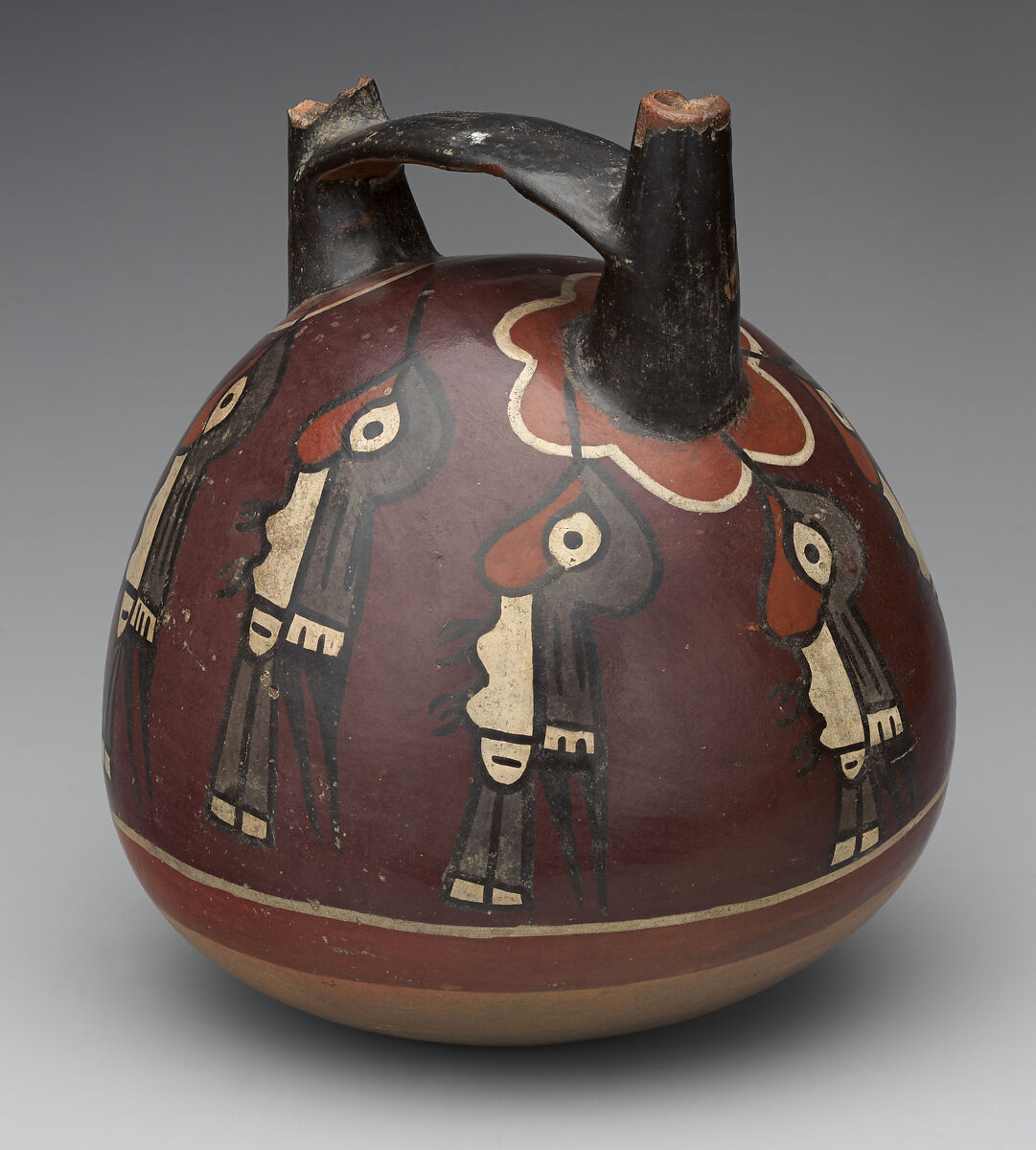 Although no ceramic workshop has been discovered yet in the Nazca territory, the high technical quality of the pottery and the complexity of the iconography indicate that polychrome vessels were likely made by craft specialists. Archaeologists discovered scattered evidence of ceramic production (pigments, paint brushes, and polishers) at Cahuachi, the main Nazca monumental site. Finely painted polychrome vessels are well known as the principal vehicle of Nazca ideology. Double-spout bottles such as this one were used as funerary offerings. They were also an integral part of the ritual consumption of food and corn beer carried out at Cahuachi. The use of bottles with elaborate decoration was related to feasts, processions, and other prestige building activities carried out by high-status individuals and households. Nazca iconography includes a great variety of plants, animals, and more than twenty species of birds. This bottle shows hummingbirds with long thin beaks feeding on flowers painted at the base of each spout.
