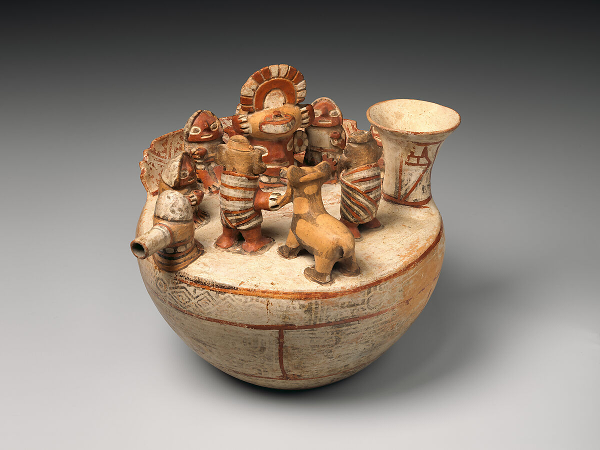 The vessel was modeled with a large opening on one side and a smaller spout on the other. This kind of vessel, known as a paccha, is thought to be related to water rituals. If so, this object reveals in its composition the intimate relationship between rulers, feasts, water, and community in this part of the Central Andes.