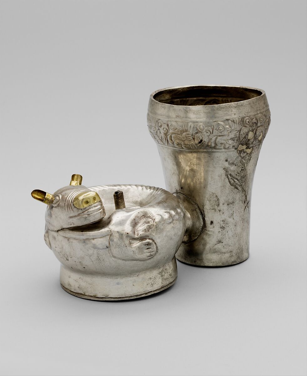 This vessel was reportedly part of a large group of silver objects recovered from a single site on Peru’s North Coast—in one account, the site of Mocollope, in the Chicama Valley; in another, in the Moche Valley, near Chan Chan, capital of the Chimú kingdom. The group includes a range of forms, from elegantly plain, tall beakers to containers in the form of human figures and animals. Chan Chan itself was famed for its artists, and a striking percentage of the population, perhaps twelve thousand in this city of forty thousand, was engaged with craft production (Topic, 1990). The city was a rich prize for the Incas when they conquered the North Coast around 1475 CE; later historical accounts note that the Inca captured the Chimú silversmiths and pressed them into service in Cusco, the Inca capital high in the Andes. Other Chimú metalworkers were relocated to the Lake Titicaca region (Zori, 2016). This strategy of breaking up conquered polities was designed to diffuse the Chimú kingdom’s power and potential threat. The Incas’ keen interest in metalworking, however, also reminds us of the importance of these ritual objects and their makers in Andean statecraft.