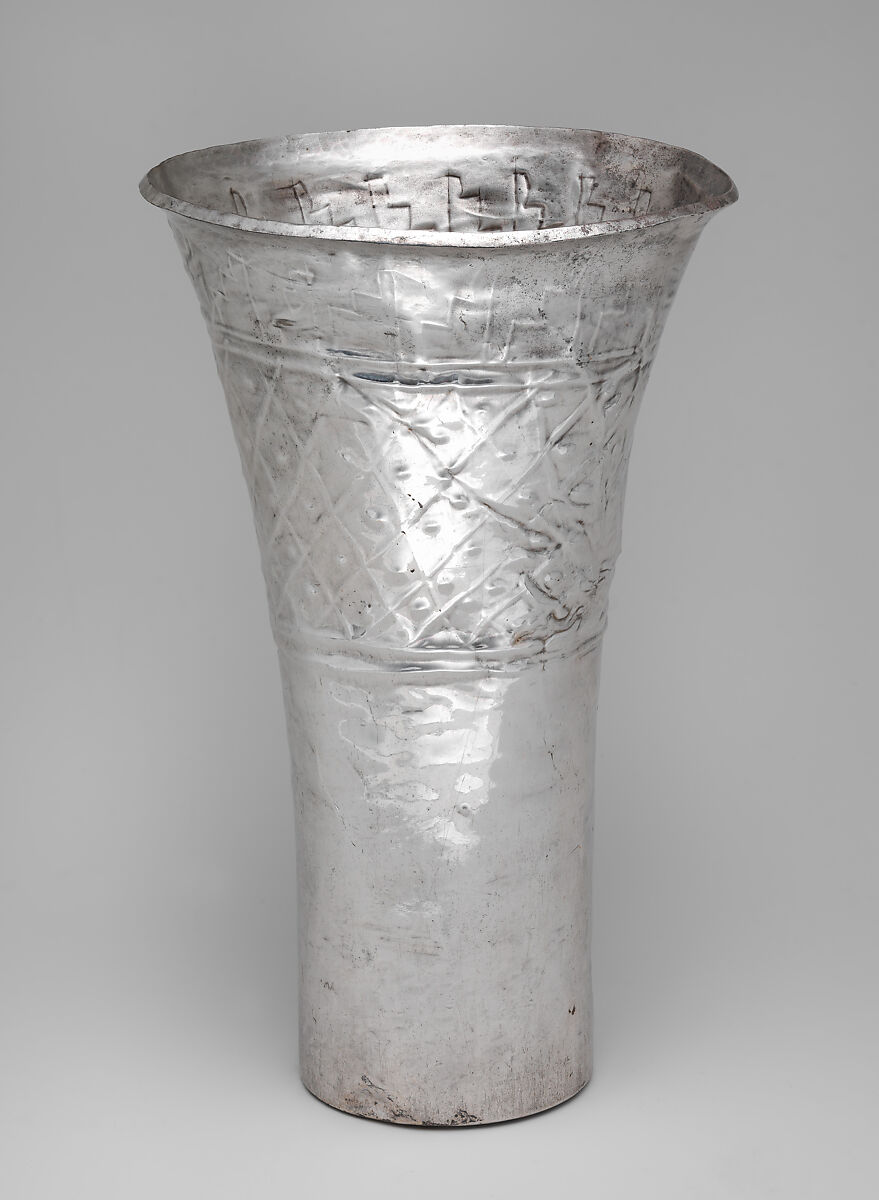 Unlike gold, which was available as nuggets and flakes in alluvial deposits and worked by metal artists of Peru’s North Coast since at least the first millennium BCE, working silver was a more complex process. Silver had to be sourced in veins in the highlands and then smelted (separated from other minerals) and refined. Chimú metalsmiths mastered the necessary technologies and brought silver working to new heights after 1000 CE. Silver was used to create items of personal adornment, but it was especially popular for drinking and serving vessels such as this flaring beaker with bands of geometric and zoomorphic motifs rendered in repoussé on the upper third of the vessel.