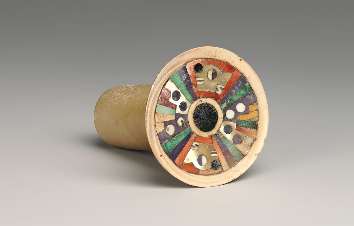 Artists of the Wari empire created extraordinarily fine weavings and burnished ceramics, as well as refined mosaic works in shell and stone. The capital of the empire, known as Wari (sometimes spelled Huari), was in the central highlands of Peru, near the modern city of Ayacucho, but its influence was felt from Chiclayo in the north to Moquegua in the south. This expansive domination provided a variety of luxury materials used to produce goods for the elite. For example, this ear flare and its mate (1978.412.215) combine orange and purple Spondylus shell found in the warm waters of the coast of Ecuador and northern Peru with more local mother-of-pearl, purple muscle, and turquoise. Other Wari objects for the elite might include materials such as feathers from the Amazon and lapis lazuli from Chile.