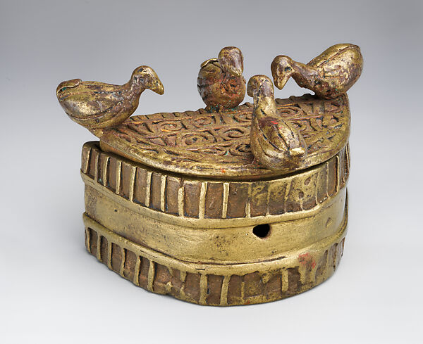 Historically, only royals and members of their entourage could possess precious metals like locally mined gold (sika) and imported silver. Akan gold production likely began in the second half of the fifteenth century, yielding approximately fourteen million ounces of metal by 1900. Gold circulated in powdered form (sika futuro) as the currency of the Asante Empire and many of its neighbors until 1901; when not accumulated as a form of personal wealth, gold dust was melted down and cast into fashionable ornaments. Regalia—including woven textiles and elaborate gold ornaments—have been omnipresent aspects of Akan courtly life since at least the fifteenth century. Members of the royal goldsmiths' guild exclusively produced gold ornaments, including staffs, rings, and symbolic figures to attach to clothing or furniture. According to oral tradition, these highly skilled artists claimed ancestry from Fusu Kwabi, who supposedly descended from heaven in the 1400s to teach men how to work gold. They also produced elaborate sets of brass weights, scales, measuring spoons, and containers for the weighing and storage of gold dust. Smaller boxes such as this were known as abamphruwa, while larger storage vessels were called kuduo. Most sets contained two or three of the smaller boxes; as such, another box in the Met’s collection (1979.206.181a, b) is considered the pair to this example. Small boxes may also have doubled as weights, particularly when filled with metal filings to adjust their weight to meet the standard.