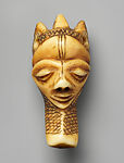 In addition to carving masks for men’s initiation masquerades, Pende artists were responsible for the creation of masks in miniature form to be worn as pendants. Wooden pendants are made by healing specialists and are prescribed by diviners as remedies for illness or misfortune. In contrast, their ivory counterparts, ikhokho (sing. gikhokho), are made by professional sculptors to be worn as decoration. While they depict humans, they never represent actual people, because to do so would be seen as sorcery. Elephant ivory is the material of choice, due to its texture and resistance to cracking, but carvers also use the thighbones of hippopotamuses. The Pende prize the whiteness of the ivory and regularly scrub the ornament's surface with water and abrasive sand, blurring the features over time.