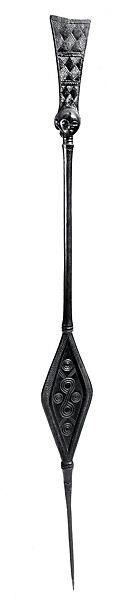 The eighteenth and nineteenth centuries saw a flourishing Luba sculptural tradition that was designed to identify and glorify the king, chiefs, and titled officials who constituted the complex hierarchy of leadership within the Luba empire. Like many African peoples, the Luba consider their kings to be divine, endowed with supernatural powers that can influence social well-being and the productivity of the land. As descendants of the empire's founders, Luba leaders possess bulopwe, sacred blood, which enables them to rule and entitles them to own magnificent regalia, including carved wooden objects, metal articles, beads, fur, and feathers. Luba rites of royal investiture center on the transferal of these articles of insignia, which are considered the embodiment of the very essence of kingship. The sculptural forms within this collection derive from such utilitarian implements as three-pronged bow rests and paddle-shaped staffs, objects that recall the hunting and fishing economy of the Luba past.