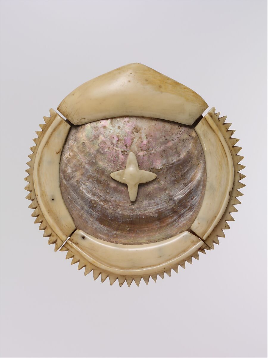 Worn exclusively by male chiefs, breastplates in the Fiji Islands were precious and powerful objects and a prestigious element of ceremonial attire. When worn into battle, they were said to make the wearer invulnerable to enemies. Breastplates were suspended from two cords tied together behind the wearer’s neck, while a third cord passed around the body to hold the ornament in place on the chest during battle and other strenuous activities. Although worn by Fijian chiefs, breastplates were created by Tongan and Samoan artists, who had begun to settle in Fiji by the late 1700s. The plates were fashioned primarily from whale ivory, a precious material often used in combination with pearl shell. The ivory elements on some examples resemble stars or crescent moons, but their precise significance is unknown.