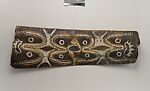 This panel is one of over 270 original paintings commissioned from Kwoma artists in the village of Mariwai in 1970 and 1973 by Douglas Newton, the first curator of Oceanic art in the Department of the Arts of Africa, Oceania and the Americas. Once completed, they were shipped to New York and installed in the galleries. In 2007, when the Oceania galleries at the Metropolitan Museum were renovated, the panels were attached to a new superstructure. Although less steeply pitched than the Kwoma houses found in villages today, the installation evokes the essential form of a ceremonial house ceiling. Together these suspended panels form an impressive and spectacular installation in the Metropolitan Museum which, at 80.4 feet (24.5 meters) end-to-end, is the largest contemporary art installation in the museum.