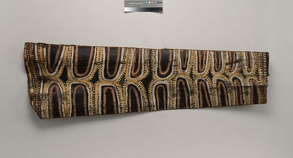 This panel is one of over 270 original paintings commissioned from Kwoma artists in the village of Mariwai in 1970 and 1973 by Douglas Newton, the first curator of Oceanic art in the Department of the Arts of Africa, Oceania and the Americas. Once completed, they were shipped to New York and installed in the galleries. In 2007, when the Oceania galleries at the Metropolitan Museum were renovated, the panels were attached to a new superstructure. Although less steeply pitched than the Kwoma houses found in villages today, the installation evokes the essential form of a ceremonial house ceiling. Together these suspended panels form an impressive and spectacular installation in the Metropolitan Museum which, at 80.4 feet (24.5 meters) end-to-end, is the largest contemporary art installation in the museum.