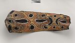 This panel is one of over 270 original paintings commissioned from Kwoma artists in the village of Mariwai in 1970 and 1973 by Douglas Newton, the first curator of Oceanic art in the Department of the Arts of Africa, Oceania and the Americas. Once completed, they were shipped to New York and installed in the galleries. In 2007, when the Oceania galleries at the Metropolitan Museum were renovated, the panels were attached to a new superstructure. Although less steeply pitched than the Kwoma houses found in villages today, the installation evokes the essential form of a ceremonial house ceiling. Together these suspended panels form an impressive and spectacular installation in the Metropolitan Museum which, at 80.4 feet (24.5 meters) end-to-end, is the largest contemporary art installation in the museum.