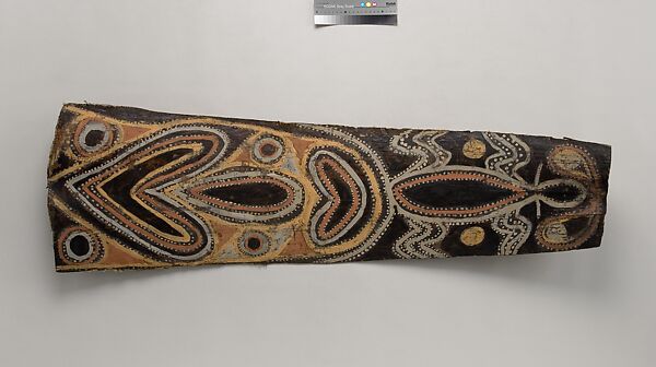 This panel is one of over 270 original paintings commissioned from Kwoma artists in the village of Mariwai in 1970 and 1973 by Douglas Newton, the first curator of Oceanic art in the Department of the Arts of Africa, Oceania and the Americas. Once completed, they were shipped to New York and installed in the galleries. In 2007, when the Oceania galleries at the Metropolitan Museum were renovated, the panels were attached to a new superstructure. Although less steeply pitched than the Kwoma houses found in villages today, the installation evokes the essential form of a ceremonial house ceiling. Together these suspended panels form an impressive and spectacular installation in the Metropolitan Museum which, at 80.4 feet (24.5 meters) end-to-end, is the largest contemporary art installation in the museum.