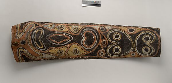 This panel is one of over 270 original paintings commissioned from Kwoma artists in the village of Mariwai in 1970 and 1973 by Douglas Newton, the first curator of Oceanic art in the Department of the Arts of Africa, Oceania and the Americas. Once completed, they were shipped to New York and installed in the galleries. In 2007, when the Oceania galleries at the Metropolitan Museum were renovated, the panels were attached to a new superstructure. Although less steeply pitched than the Kwoma houses found in villages today, the installation evokes the essential form of a ceremonial house ceiling. Together these suspended panels form an impressive and spectacular installation in the Metropolitan Museum which, at 80.4 feet (24.5 meters) end-to-end, is the largest contemporary art installation in the museum.
