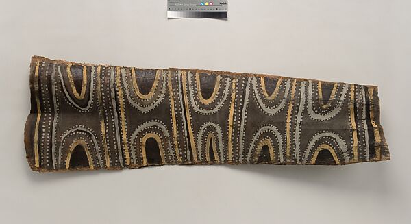 This panel is one of over 270 original paintings commissioned from Kwoma artists in the village of Mariwai in 1970 and 1973 by Douglas Newton, the first curator of Oceanic art in the Department of the Arts of Africa, Oceania and the Americas. Once completed, they were shipped to New York and installed in the galleries. In 2007, when the Oceania galleries at the Metropolitan Museum were renovated, the panels were attached to a new superstructure. Although less steeply pitched than the Kwoma houses found in villages today, the installation evokes the essential form of a ceremonial house ceiling. Together these suspended panels form an impressive and spectacular installation in the Metropolitan Museum which, at 80.4 feet (24.5 meters) end-to-end, is the largest contemporary art installation in the museum.