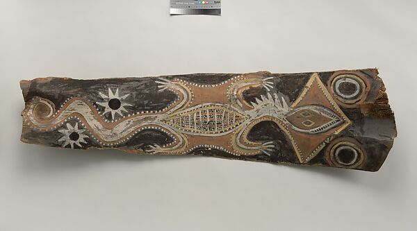 This panel is one of over 270 original paintings commissioned from Kwoma artists in the village of Mariwai in 1970 and 1973 by Douglas Newton, the first curator of Oceanic art in the Department of the Arts of Africa, Oceania and the Americas. Once completed, they were shipped to New York and installed in the galleries. In 2007, when the Oceania galleries at the Metropolitan Museum were renovated, the panels were attached to a new superstructure. Although less steeply pitched than the Kwoma houses found in villages today, the installation evokes the essential form of a ceremonial house ceiling. Together these suspended panels form an impressive and spectacular installation in the Metropolitan Museum which, at 80.4 feet (24.5 meters) end-to-end, is the largest contemporary art installation in the museum.
