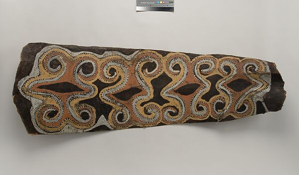 This panel is one of over 270 original paintings commissioned from Kwoma artists in the village of Mariwai in 1970 and 1973 by Douglas Newton, the first curator of Oceanic art in the Department of the Arts of Africa, Oceania and the Americas. Once completed, they were shipped to New York and installed in the galleries. In 2007, when the Oceania galleries at the Metropolitan Museum were renovated, the panels were attached to a new superstructure. Although less steeply pitched than the Kwoma houses found in villages today, the installation evokes the essential form of a ceremonial house ceiling. Together these suspended panels form an impressive and spectacular installation in the Metropolitan Museum which, at 80.4 feet (24.5 meters) end-to-end, is the largest contemporary art installation in the museum.