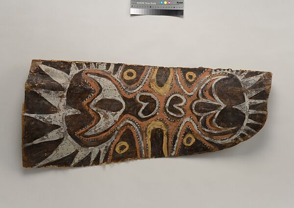 This panel is one of over 270 original paintings commissioned from Kwoma artists in the village of Mariwai in 1970 and 1973 by Douglas Newton, the first curator of Oceanic art in the Department of the Arts of Africa, Oceania and the Americas. Once completed, they were shipped to New York and installed in the galleries. In 2007, when the Oceania galleries at the Metropolitan Museum were renovated, the panels were attached to a new superstructure. Although less steeply pitched than the Kwoma houses found in villages today, the installation evokes the essential form of a ceremonial house ceiling. Together these suspended panels form an impressive and spectacular installation in the Metropolitan Museum which, at 80.4 feet (24.5 meters) end-to-end, is the largest contemporary art installation in the museum.
