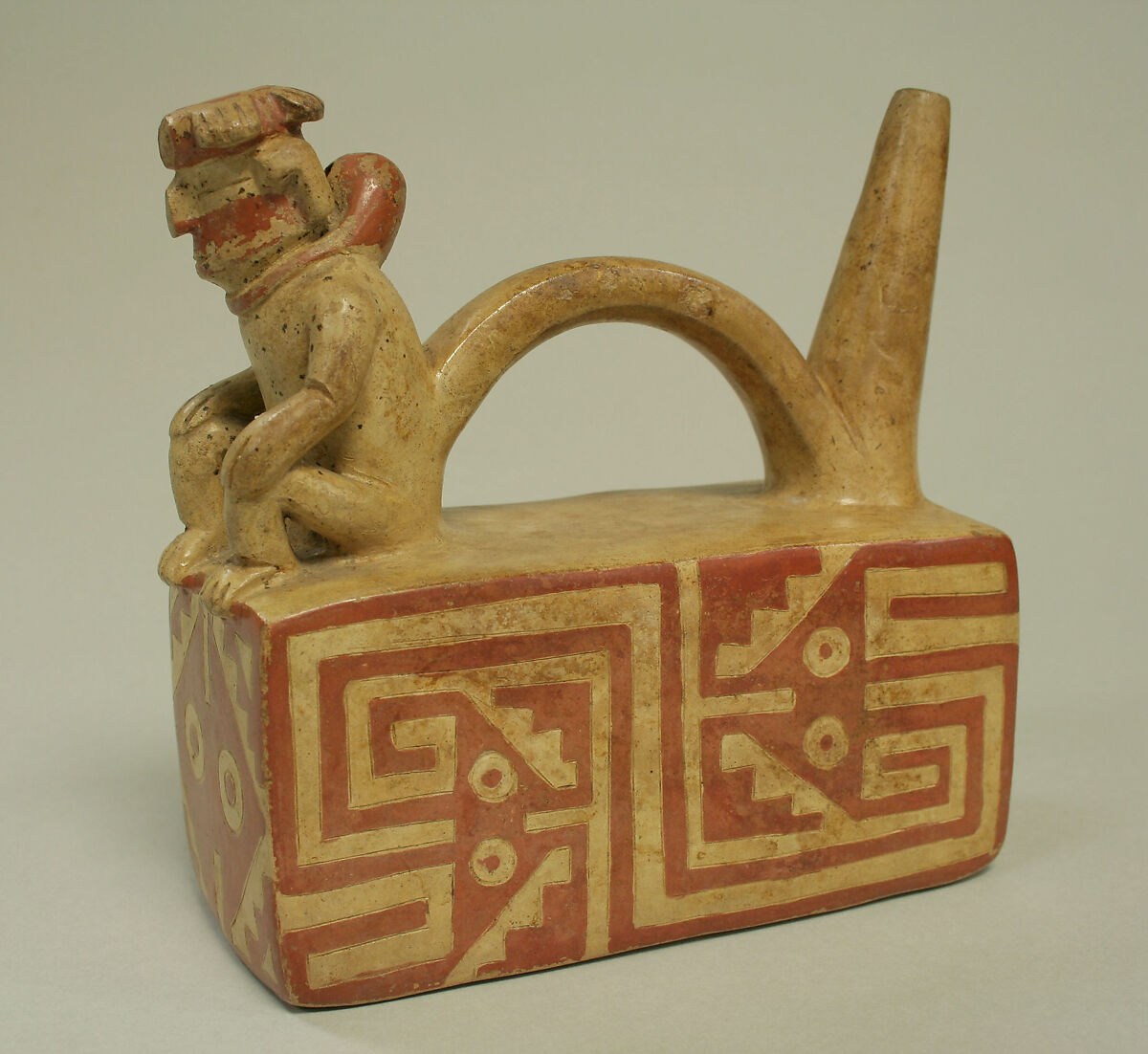 - Title: Bridge and Spout Bottle with Figure on Throne
