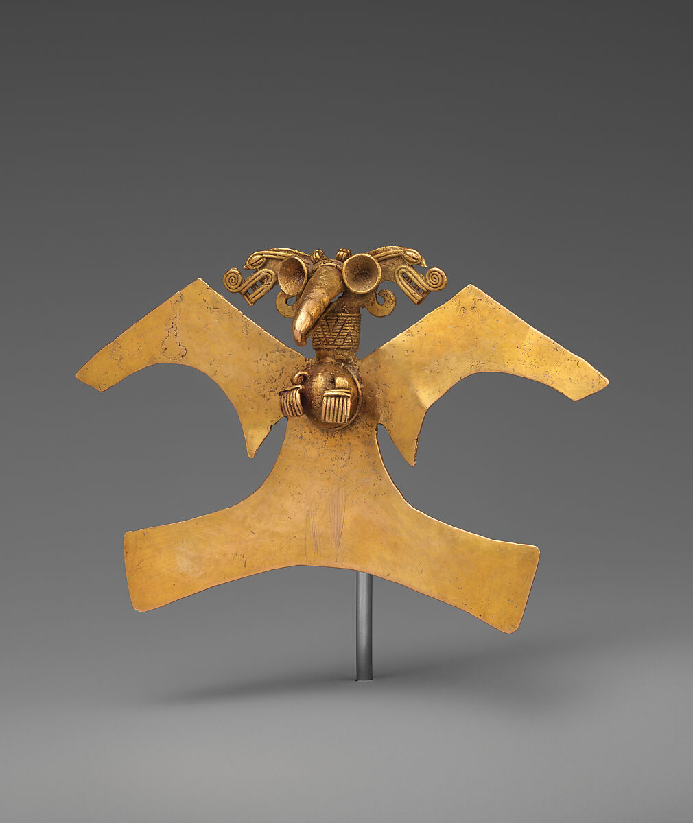 Avian pendants cast in gold, called águilas (eagles) by the invading Spanish, were symbols of mythological power in the region now known as Veraguas, Panama. Leaders in the Caribbean region widely exchanged such pendants and wore them to emulate the natural prowess of birds of prey. The supernatural birds have fanciful, hybrid features— such as neck ornaments, elaborate crests, and other protuberances—that complicate the identification of a recognizable species. The sound effects made by the pendants were important: some birds have bells for eyes, while others have bell chambers for bodies. In ceremonies the audience could have heard a ruler before they saw him or her.