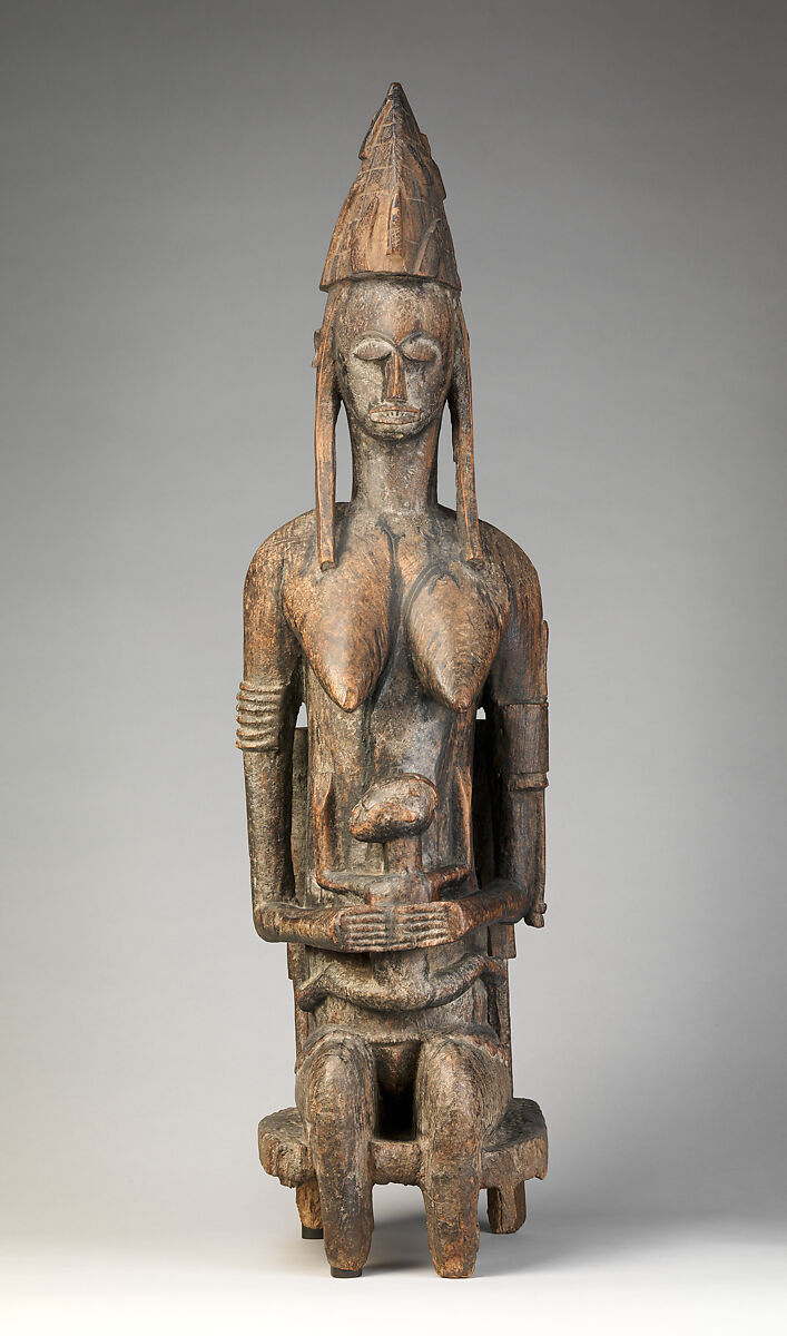 Bamana notions of ideal beauty and character are evoked in this figure of a mother and child. The figure is part of a corpus of large, relatively naturalistic sculptures whose rounded volumes and variety of gestures depart from the angular forms and stiff postures characteristic of many other types of Bamana sculpture. These figures are displayed at the annual ceremonies of "Jo", an association of initiated Bamana men and women, and at the rituals of "Gwan", a related society whose purpose is to help women conceive and bear children. Groups of sculptures which were collectively owned by individual communities to be publicly exhibited on such occasions, included representations of a mother and child, a male companion, and related attendant figures.