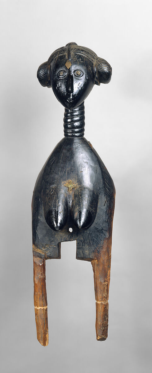 Among the Baga tributes to female power and beauty is zigiren-wöndë, who portrays an ideal spouse in the bloom of youthful motherhood. Her depiction features full breasts and lustrous black skin. Signs of her cultivated refinement include braided hair, markings under her eyes, rings around her neck, and brass adornments on her forehead, eyes, and between her breasts. Commissioned by community elders, this headdress was performed by young men at initiations and wakes. On such occasions, a full-length costume of cloth and raffia affixed below the sculpture’s breasts concealed the dancer, who held the sculpture aloft by its legs. The brisk choreography involved swaying back and forth, darting left and right, and running in a circle to the sound of drums and iron gongs.