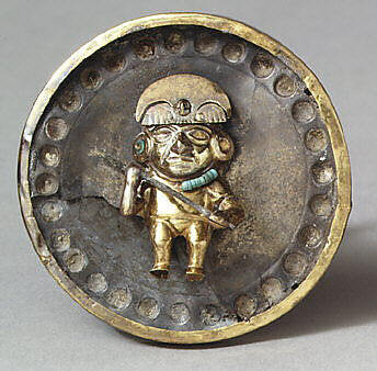 At the center of this circular earflare is a high-status warrior. The nearly three-dimensional gold figure at 4.9 cm tall stands out sharply from the tarnished silver of the disk. The warrior wears a shirt, loincloth, and a crescent-shaped headdress, the lower section of which takes the shape of an owl with extended wings and a head in high relief. Beads of blue-green stone make up the warrior’s necklace and are inlaid in his earflares. The warrior’s proper right arm bends slightly and extends outward while the proper left arm is bent at the elbow, to hold his war club, made of silver sheet metal. This earflare is one of a pair, and its mate (1979.206.1242a-c), also features a warrior, poised to hold a war club, although the pair’s war club is now missing. War clubs are prominent in Moche representations of battles and ceremonies, but they also appear to have served as generalized symbols of power; on occasion ceramic representations of war clubs adorned the rooflines of buildings.