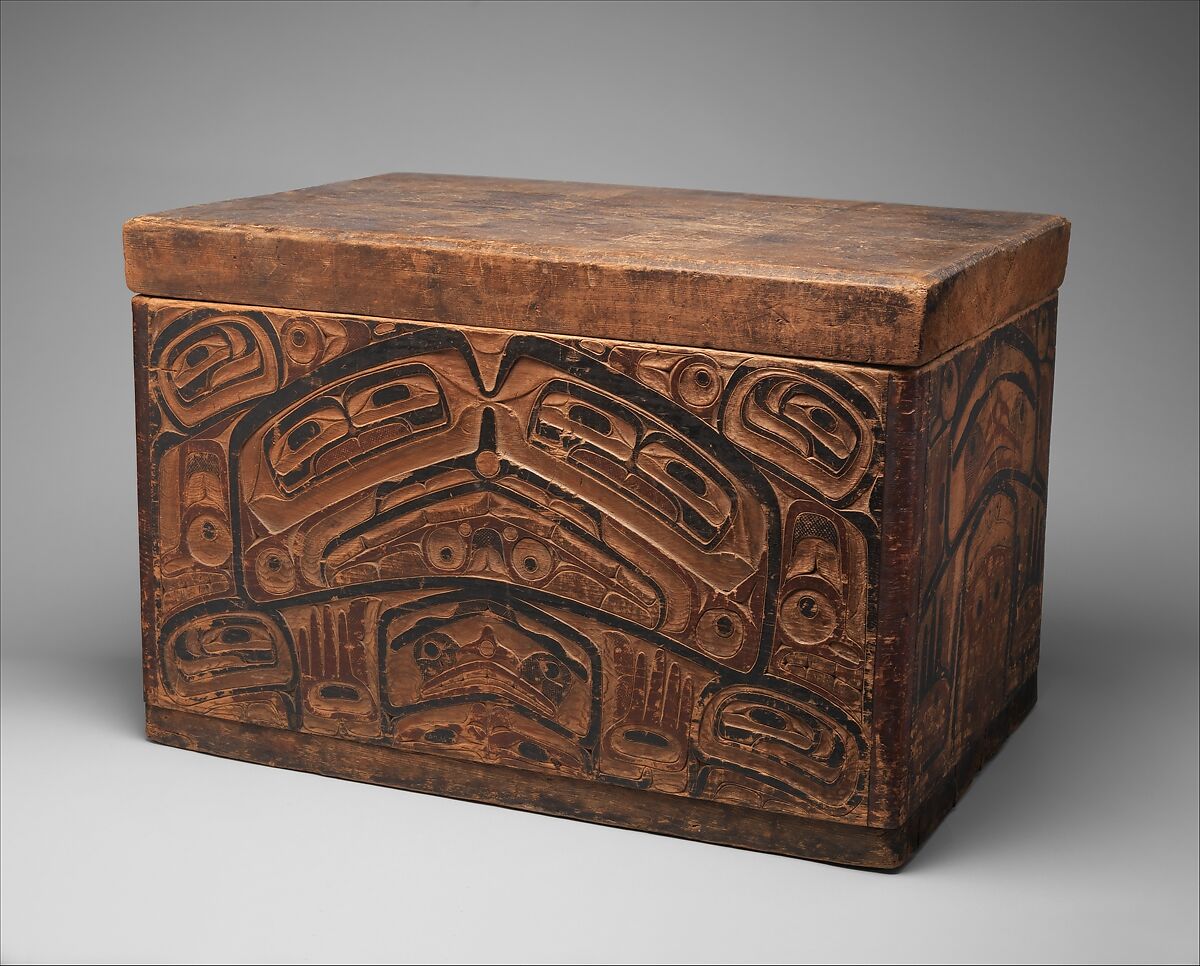 Highly embellished chests, such as this one, were used to house clan treasures and ceremonial regalia including dance robes, blankets, furs, masks, rattles, drums, copper items, and other paraphernalia. These cherished belongings were removed and used for special occasions such as dances, feasts, and other important communal celebrations. Storage boxes would also play an important role in the distribution of chiefly regalia. Finely crafted containers functioned as a form of property traded during a potlach, a large ceremonial feast and gift-giving tradition hosted by a chief during the winter months to redistribute the wealth among community members and invited guests. On certain occasions, chests and their contents were set out on display to affirm the wealth and status of a household. The distribution of, and occasionally, destruction of, lavish gifts and possessions in ceremonial practice is meant to uphold the host’s social rank and prestige. Such ceremonial feasts highlight the importance of distribution and gift-exchange among the indigenous peoples of the Pacific Northwest Coast region, and the key role finely crafted works played in community identity and ritual practice.