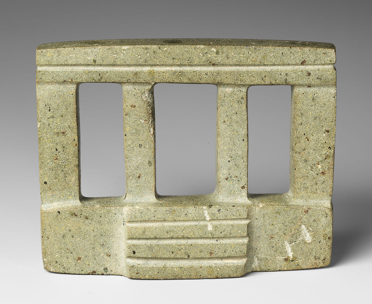 Stone architectural models in the Mezcala style primarily come from the present-day state of Guerrero in southwest Mexico. A particularly long-lived tradition, these works may have been produced over some one thousand years, beginning as early as 500 BCE. Little is known about their archaeological contexts, and there are few points of reference with surviving architecture in the region. It is possible that models with pillars like this one reference buildings with stone columns, such as those from Cuetlajuchitlán.