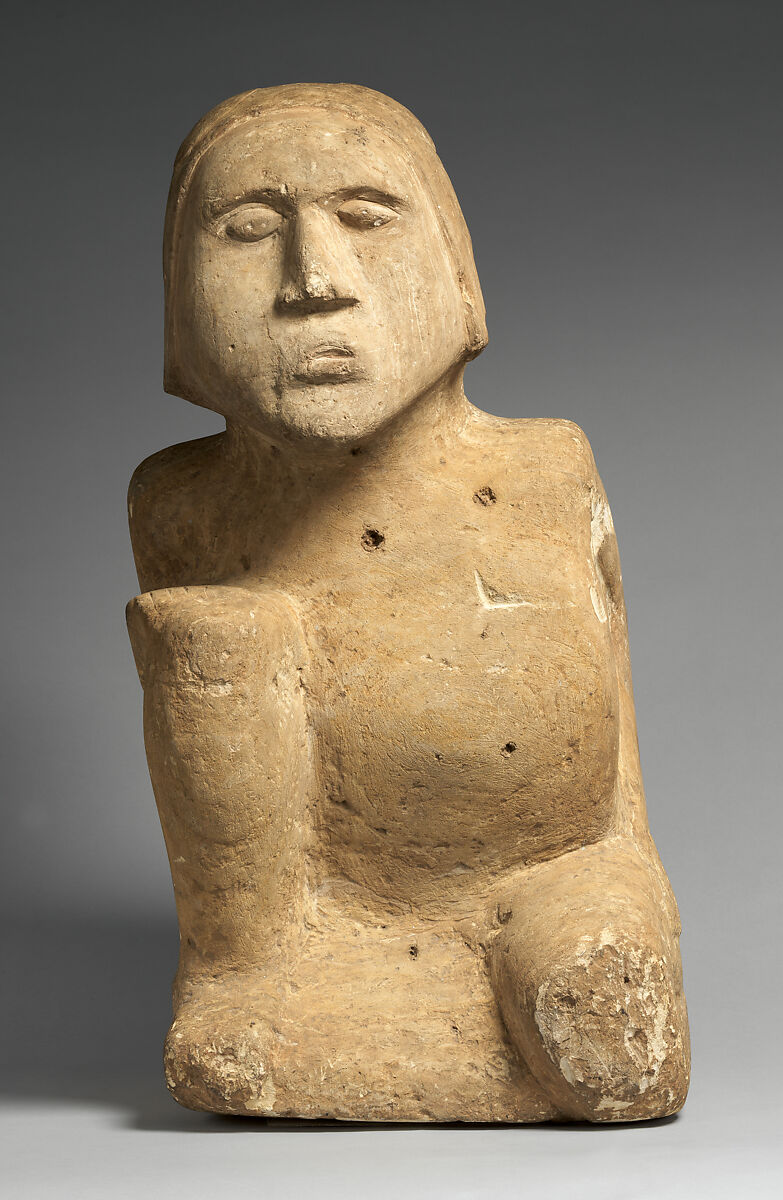 This ancestral figure was one of a male-female pair when discovered in 1895 on the banks of the Duck River in Humphreys County, Tennessee. Such figures played important roles among the more complex Mississippian societies of the Southeast during later precolonial times, when they were the focus of ancestor veneration. The figures, primarily but not exclusively male, were placed and venerated in shrine houses together with the bones of significant ancestors. The figures are known today primarily in durable stone, although examples in wood exist. They are depicted seated and are very compactly—indeed weightily—made, as illustrated by the current example. The jutting chin and well-carved eyebrow ridge accord well with the angles and plains of torso, arms, and legs. The one raised knee distinguishes him as belonging to a special group of figures, in which customarily both knees are on the ground with feet tucked under or crossed. The drawn-up right leg gives the figure an active pose and a more lifelike aspect. When discovered at the end of the nineteenth century, this figure was named Adam and his female counterpart Eve. Eve's present location is unknown.