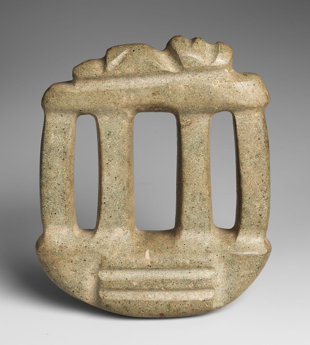 Mezcala models may have served multiple functions over time, in keeping with the Mesoamerican custom of repurposing or re-carving stone objects. Those with curved bases like this one may have been re-carved from celts, ritual tools of great symbolic importance. Several others have holes drilled into the base, which could have been used to fasten them with fiber to a larger item such as a ritual bundle, a practice widely known in archaeological and ethnographic contexts in Mesoamerica (see MMA 1994. 35.700). Offerings of Mezcala stone objects in the Templo Mayor, the sacred center of the Aztec capital, Tenochtitlan, built between 1325 and 1519, underscore the importance of these works as a continuation of tradition, as heirlooms, or as emulations of an ancient style.