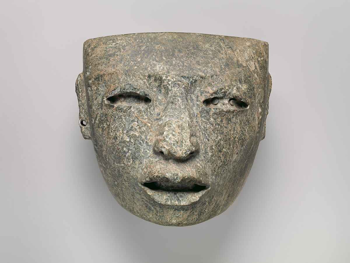 Three-dimensional stone masks depicting a conventionalized human-like face are abundant in the sculptural style associated with the great Central Mexican city of Teotihuacan. With its geometrically rendered horizontal brow, triangular nose, and oval mouth and eyes, this mask depicts an idealized facial type that seems to function as a symbol, rather than a portrait, similar to other standardized motifs present in the art of Teotihuacan. The depressions of the eyes and the mouth suggest that this very large greenstone mask might have originally possessed inlaid shell or pyrite for the depiction of eyes and teeth.