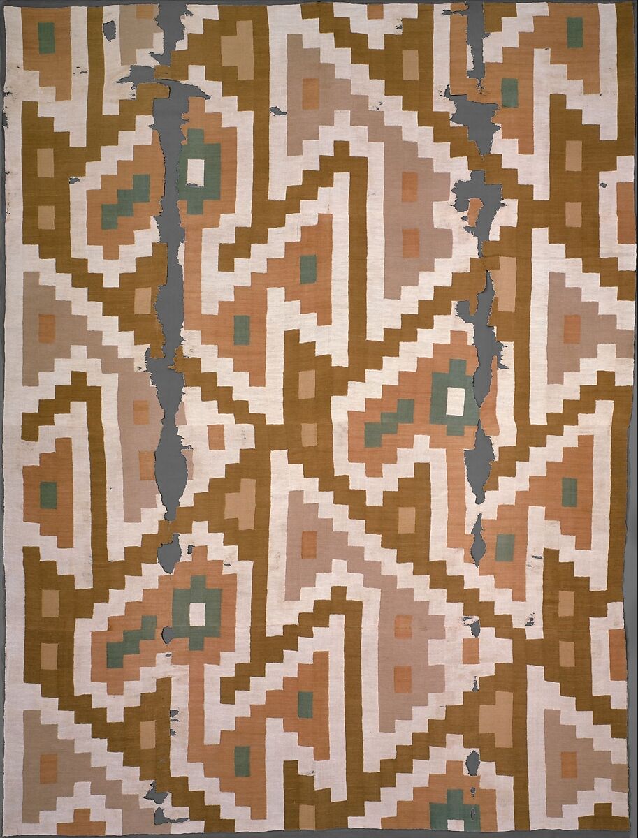 This large Chimú hanging may have once graced an interior space at Chan Chan. The geometric pattern on the textile is composed of stylized pelicans, favored motifs at this seaside city. Similar designs were also depicted in the adobe reliefs that adorned the interiors of Chan Chan palaces.