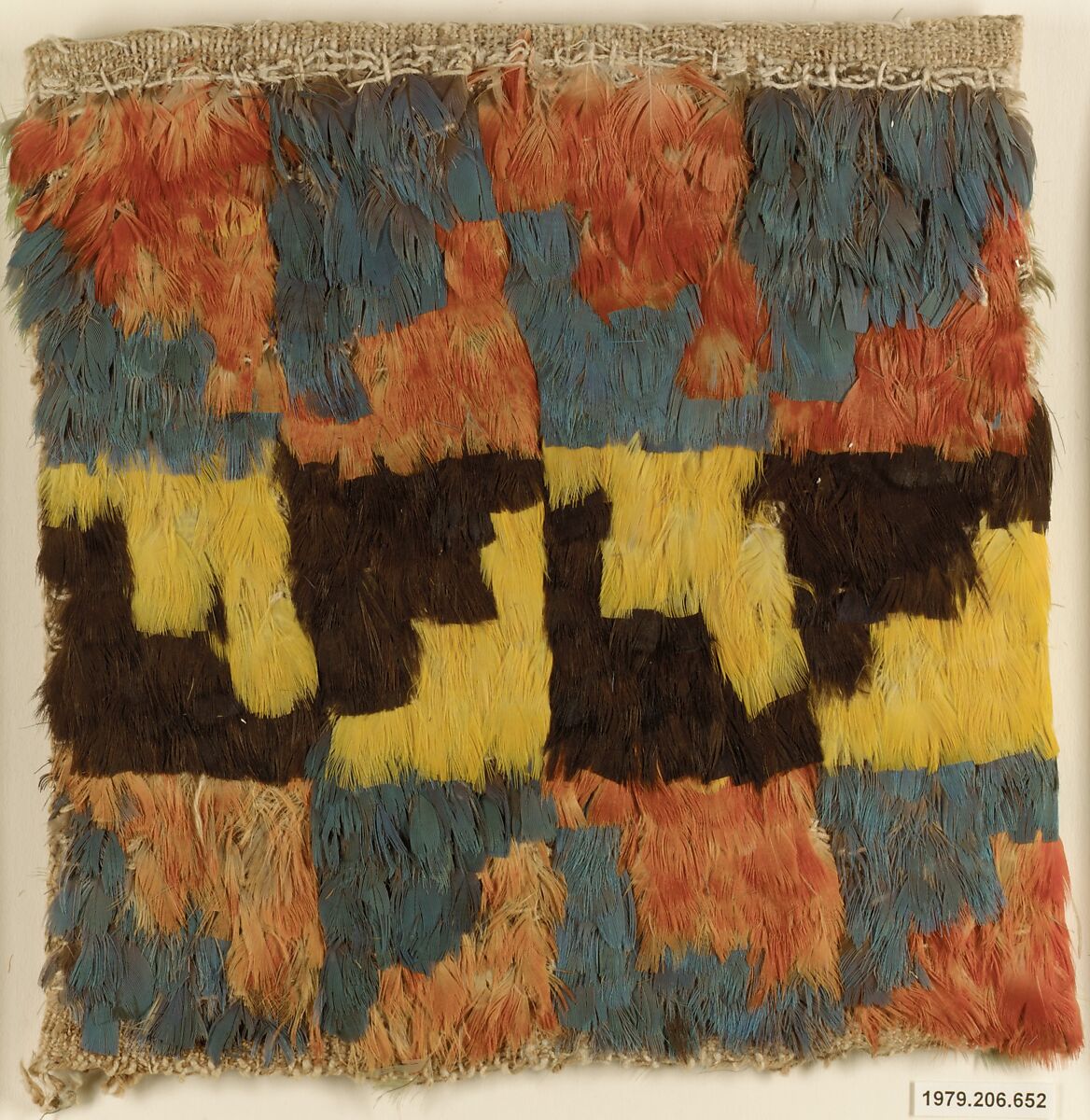 Colorful bird feathers were highly prized in ancient Peru, and textiles covered with them are among the most spectacular works of the Precolumbian world. These two miniature dresses are part of a large group of similar garments reportedly found in an offering at Ullujaya, in the lower Ica Valley in southern Peru. Their manufacture follows the conventions used for full-sized male and female garments but at one-fourth to one-third the size. The women’s dresses in the group have a checkerboard design on the front, as seen here. The horizontal openings for the head and arms along the top seam are sewn closed. The function of these miniature garments in ancient Andean cultures is unclear; they may have served as symbolic substitutions in votive contexts.